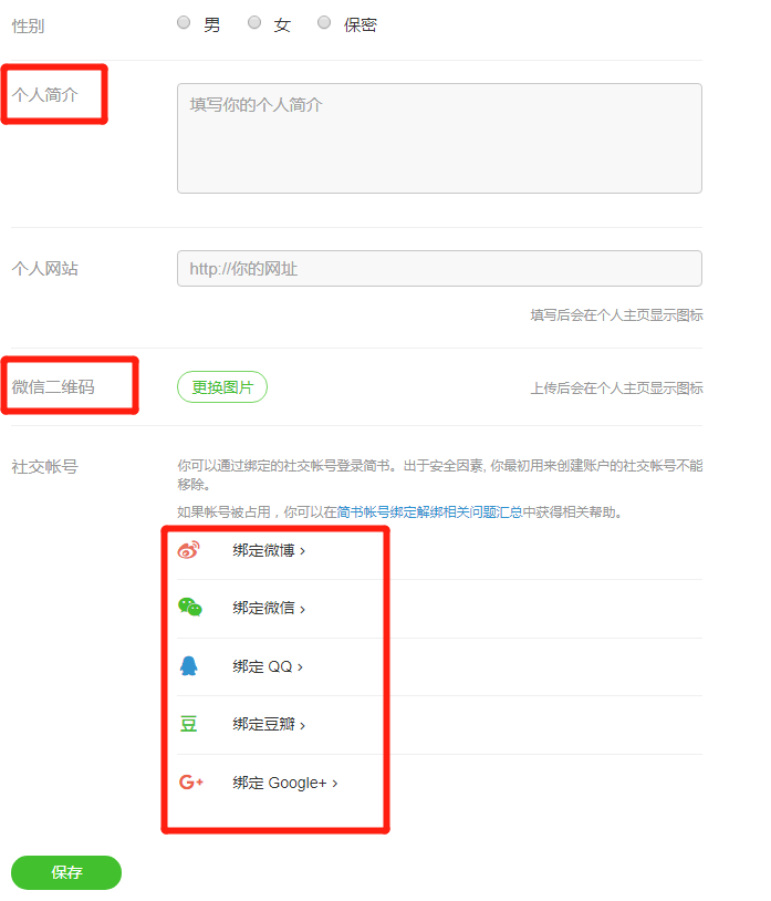 在设置中可以填写各种资料,除了类似个人简介的基本资料之外,还能绑定各个平台的账号,比如微信号、微博账号、QQ账号、豆瓣账号和Google账号等。